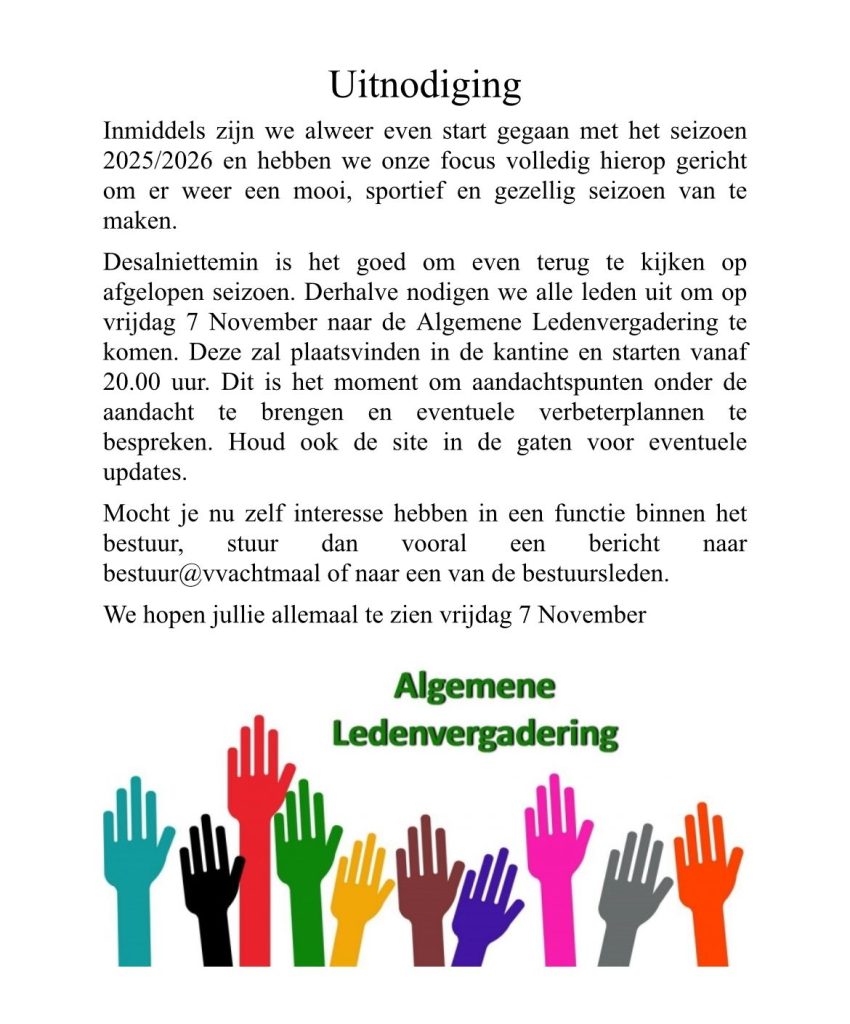 Hierbij nodigen wij jullie uit voor de jaarlijkse algemene ledenvergadering van V.V. Achtmaal. Dit jaar zal deze plaatsvinden op vrijdagavond 8 November vanaf 20.00 in onze kantine.